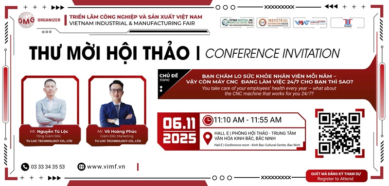 Nhằm chia sẻ những giải pháp thiết thực giúp duy trì hiệu suất, kéo dài tuổi thọ thiết bị và giảm thiểu rủi ro sản xuất, TULOCTECH đã phối hợp cùng với đơn vị ban tổ chức triển lãm VIMF Bắc Ninh 2025 để triển khai HỘI THẢO CHUYÊN ĐỀ với chủ đề: “BẠN CHĂM LO SỨC KHỎE NHÂN VIÊN MỖI NĂM – VẬY CÒN MÁY CNC ĐANG LÀM VIỆC 24/7 CHO BẠN THÌ SAO?”