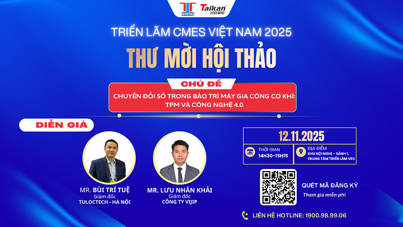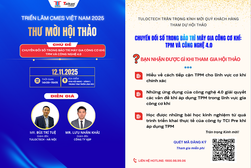 Nhằm mang đến góc nhìn thực tế cùng các ứng dụng mới nhất trong công tác bảo trì máy gia công cơ khí, TULOCTECH trân trọng kính mời Quý Anh/Chị tham dự hội thảo: “Chuyển đổi số trong bảo trì máy gia công cơ khí: TPM và Công nghệ 4.0”.
